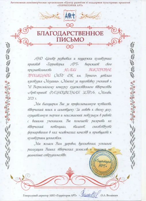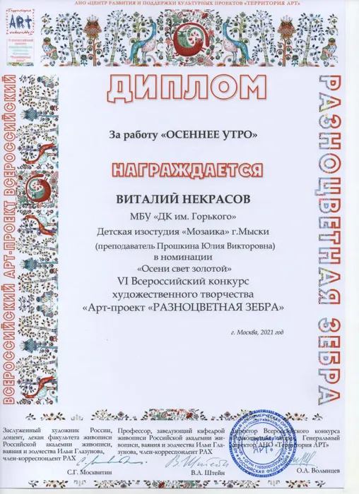В канун Нового года администрация Дворца культуры имени Горького получила ценный пакет из Москвы, где недавно были подведены итоги VI Всероссийского конкурса художественного творчества «Арт-проект «Разноцветная зебра». Этот статусный конкурс проходил в дистанционном режиме с 05.06.2021г по 25.10.2021г. и представлял собой соревнование на лучшие рисунки и декоративно-прикладные работы разнообразных тематических и стилевых направлений.