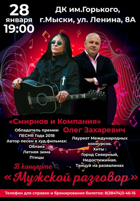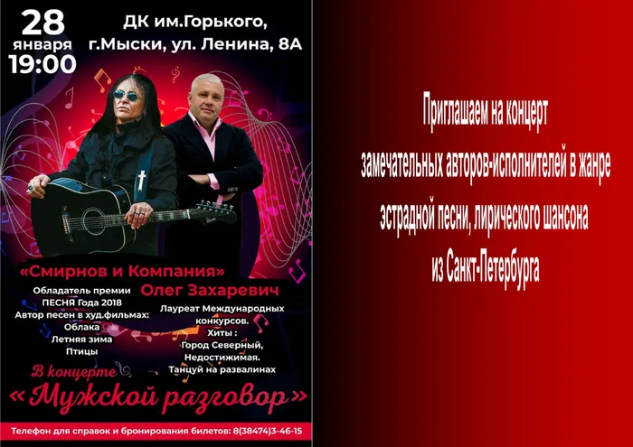 28 января в 19:00 во Дворце культуры имени Горького состоится программа "Мужской разговор" - концерт замечательных авторов-исполнителей в жанре эстрадной песни, лирического шансона из Санкт-Петербурга!