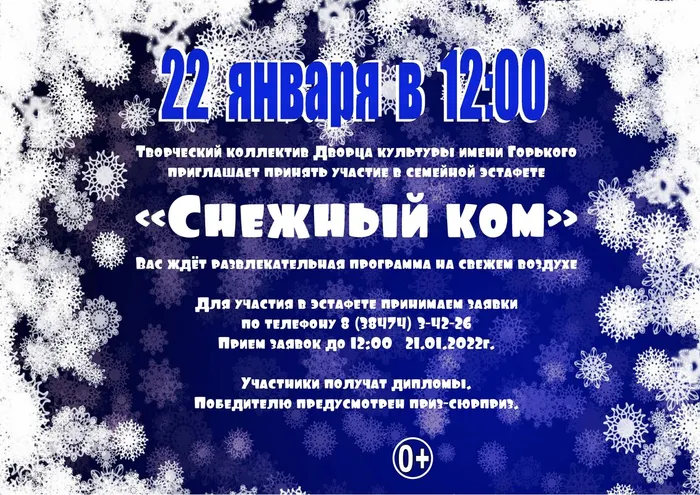 Творческий коллектив Дворца культуры имени Горького приглашает принять участие в весёлой семейной эстафете «Снежный ком».